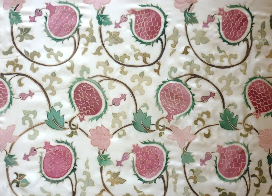 These pieces are all hand crafted on 100% silk. They are inspired by the Silk Route, and based on patterns and motifs found in Central Asia and India.